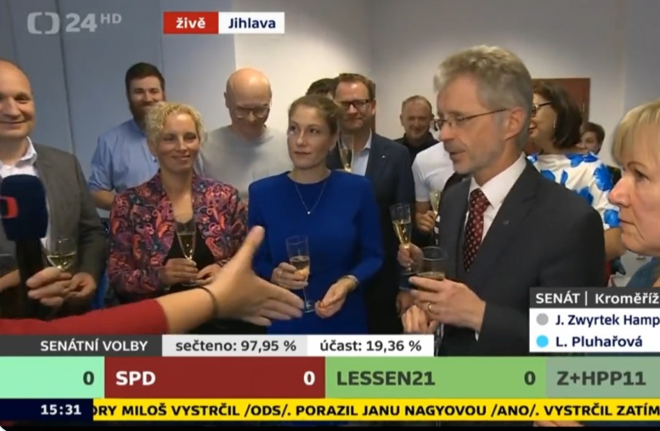 Redaktorka veřejnoprávní České televize Blanka Poulová si připila s Milošem Vystrčilem na vítězství. (Foto: Twitter / Česká televize)Redaktorka @CT24zive @CzechTV Blanka Poulová si připíjí s Milošem Vystrčilem na vítězství 🙉 pic.twitter.com/3ulte1xLcY— Demokratická opozice (@demoblok) October 1, 2022