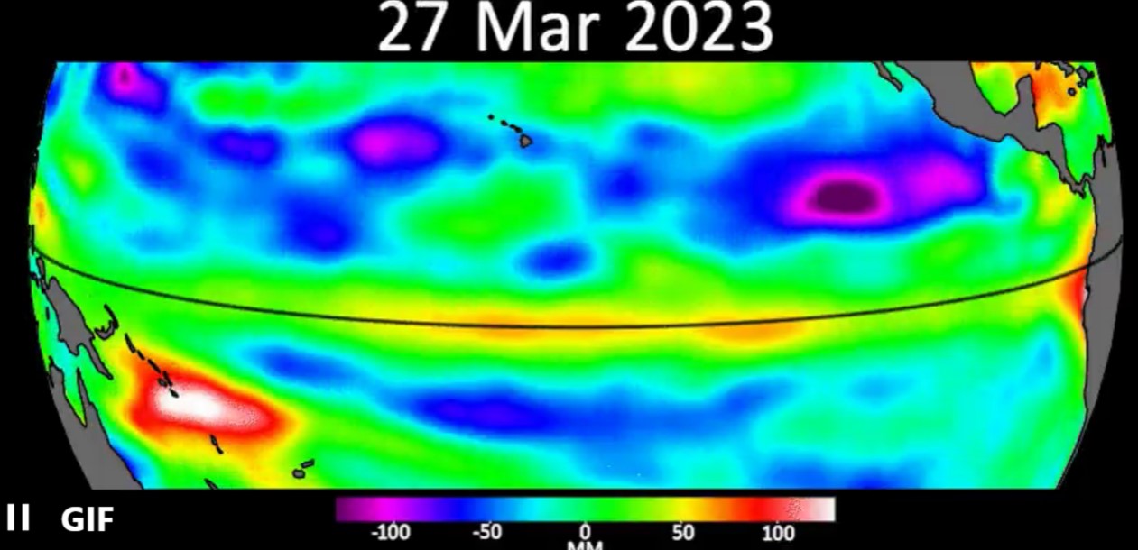 Laboratoř tryskového pohonu NASA v jižní Kalifornii identifikovala "potenciálního předchůdce" podmínek El Niño poté, co jeden z jejích satelitů zaznamenal mohutnou vlnu teplé vody, která se pohybuje přes rovníkový Pacifik. (Foto: Twitter)JPL uvedla, že americko-evropská družice Sentinel-6 Michaela Freilicha, popisovaná jako "Kelvinovy vlny", ukazuje zvednutou hladinu oceánu o šířce přibližně 2 až 4 palce a …