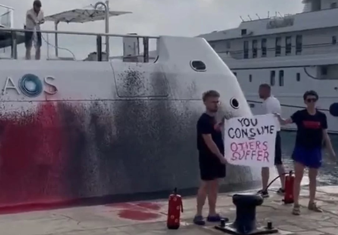 Veganští protestující v sobotu poničili superjachtu dědičky Walmartu Nancy Waltonové na španělské Ibize. (Foto: Twitter)Krajně levicoví aktivisté z organizace Futuro Vegetal posprejovali jachtu za 240 milionů dolarů červenou a černou barvou.Jeden z členů posádky řekl deníku Daily Mail, že škoda bude Nancy Waltonovou stát miliony.Hrdě pózovali před poničenou jachtou s nápisem "Vy konzumujete, jiní trpí".Eco …